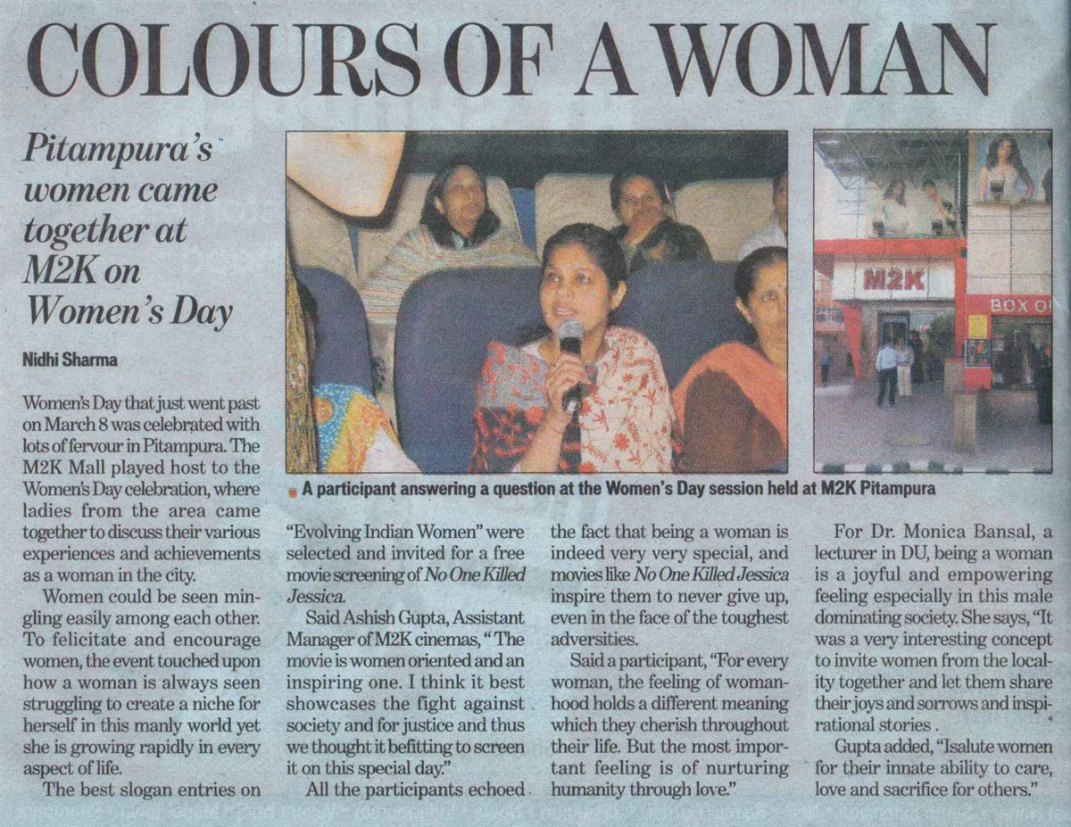 M2K Cinemas salutes women who are growing rapidly in every aspect of life. As a tribute to Women’s of India, M2K Cinemas celebrated Women’s Day at M2K Mall, Pitampura. As a part of the event, a slogan contest for women on “Evolving Indian Women” was conducted. The best entries were invited for the event which involved discussion on “Evolving Indian Women” and free movie screening of “No One Killed Jessica”, a women oriented movie showing the fight of a woman for justice. Women actively participated in the discussion and all of them echoed the fact that being a woman is indeed very special.